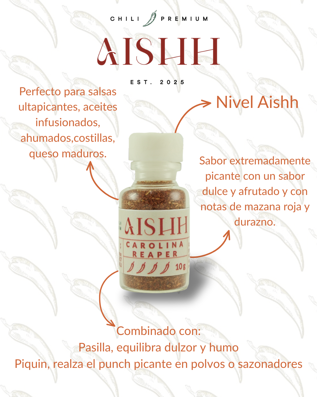 Combinaciones ideales: Con Pasilla, equilibra dulzor y humo; con Piquín realza el punch picante en polvos o sazonadores.